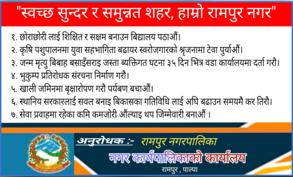 असार ७ पाल्पाको रामपुरमा बालश्रम दु्रव्यबार विरुद्धको सचेतना मुलक कार्यक्रम रामपुर पाल्पामा भएको छ । होटल न्यु श्रीनगरमा भएको कार्यक्रम सामाजिक डिभिजन कार्यलय तानसेन पाल्पाको आयोजना तथा रामपुर उद्योग बाणिज्य सघ रामपुर र बेस नेपालको समन्वयमा सरोकारवालाहरु सग सचेतना तथा अन्तरक्रिया कार्यक्रम भएको हो ।