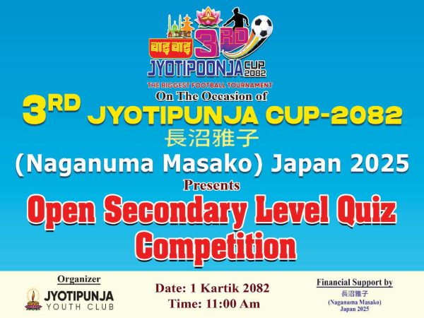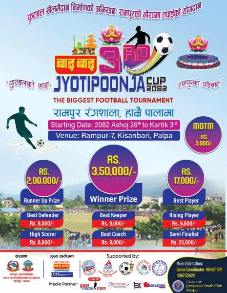 त्यसैगरी समाजसेवी हजिल दिन मियाँ र ज्योतिपुञ्ज युवा क्लबका पूर्वअध्यक्ष सुदिप गौतमले खेल जित्न मात्र नभई सिक्नका लागि पनि खेल महत्वपूर्ण हुने बताउँदै खेलाडीलाई उत्कृष्ट प्रदर्शनका लागि शुभकामना व्यक्त गर्नुभयो।