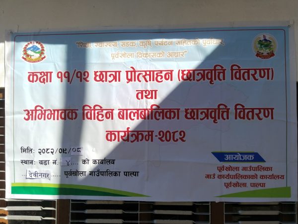शिक्षा शाखाबाट कक्षा ११/१२ का १५ जना विद्यार्थीलाई जनही ३ हजारका दरले ४५ हजार, अभिभावकविहीन १ जना प्रावि तहका विद्यार्थीलाई ५ हजार तथा मावि तहका ३ जनालाई जनही ९ हजारका दरले २७ हजार गरी जम्मा ७७ हजार रुपैयाँ बराबरको शैक्षिक सामग्री तथा नगद वितरण गरिएको थियो। वितरण कार्य गाउँपालिका अध्यक्ष नुनबहादुर थापा र उपाध्यक्ष भागिरथी भट्टराईले गर्नुभएको हो।