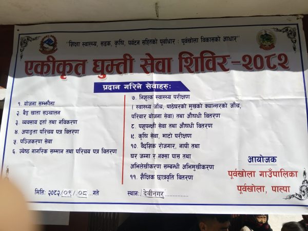 पूर्वखोला गाउँपालिकाले सेवा ग्राहीलाई सहज रुपमा सेवा प्रदान गर्ने उद्देश्यले सञ्चालन गरेको घुम्ती सेवा शिविर अन्तर्गत वडा नं. ४ देविनगरमा साँझ ७ बजेसम्म सेवा प्रदान गरेको छ।