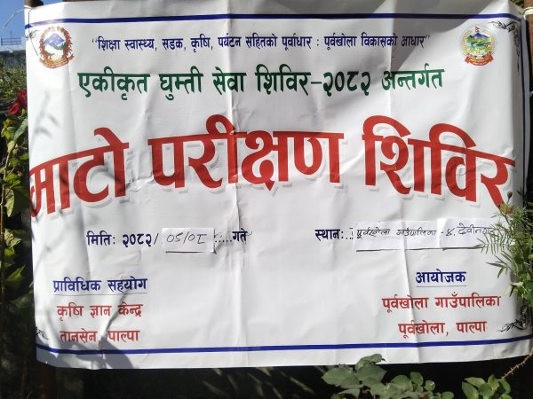 कृषि शाखाबाट ९ जना कृषकको २० वटा माटो परीक्षण गरिएकोमा १–२ वटा नमुनामा हल्का अम्लीयपन देखिएको र कृषि चुन प्रयोग गर्न सल्लाह दिइएको कृषि शाखाका शेरबहादुर बुढा र कृषि प्राविधिक अमृता भट्टराईले बताउनुभयो।
