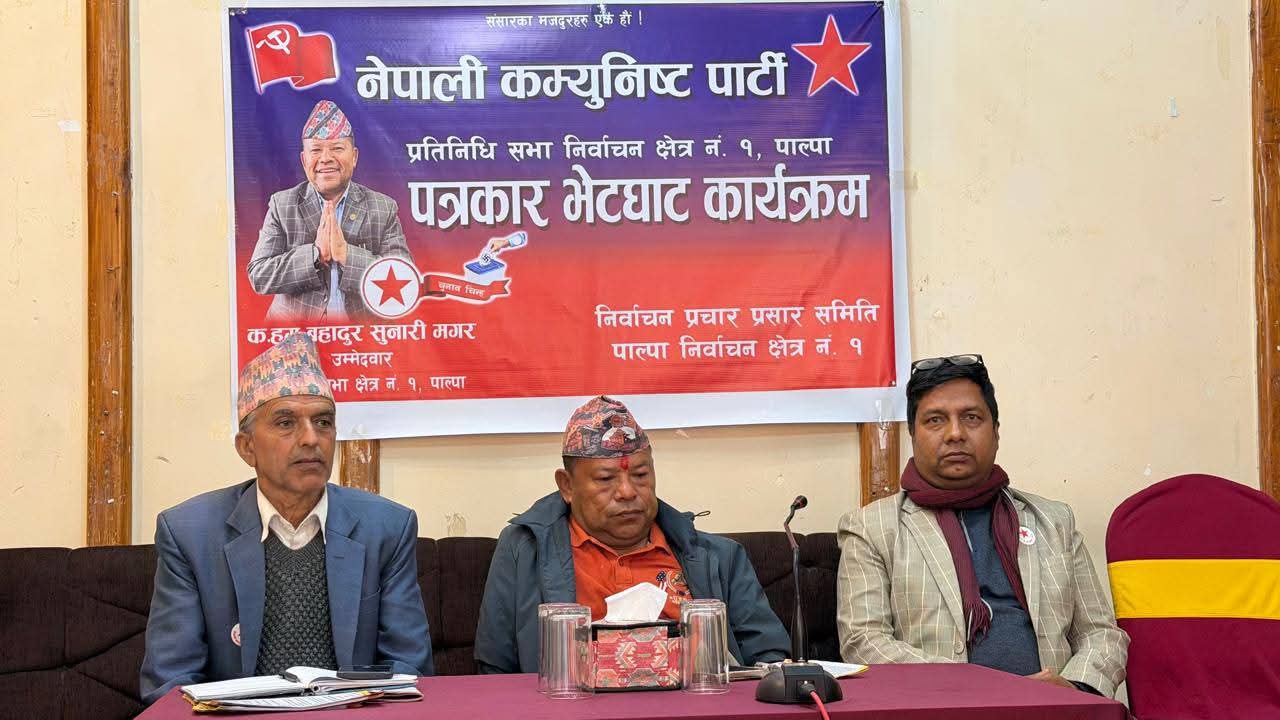 पाल्पा । नेपाली कम्युनिष्ट पार्टी का प्रतिनिधिसभा निर्वाचन क्षेत्र नं. १ का उम्मेद्वार हुम बहादुर सुनारी मगरले आफ्ना चुनावी प्रतिबद्धता सार्वजनिक गर्नुभएको छ। तानसेनमा आयोजित पत्रकार सम्मेलनमार्फत उहाँले पूर्वी पाल्पाको समग्र विकासका लागि स्पष्ट खाका प्रस्तुत गर्नुभएको हो।